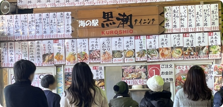 海鮮市場ならではの新鮮な海産物、その日港に上がった新鮮な魚介類をお刺身や焼き物としてお召し上がり頂けます。伊勢海老、サザエ、あわび、牡蠣、ホタテ、大アサリ等種類も豊富に取り揃えております。